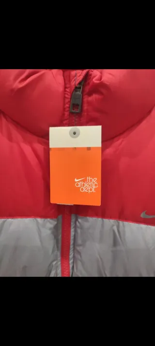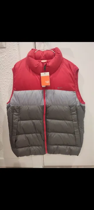 Chaleco acolchado de la marca Nike, con un diseño moderno y cómodo. - Parte superior en color rojo. - Zona central y baja en color gris. - Cierre de cremallera frontal.