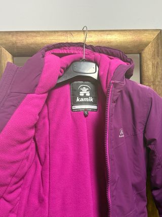 Chaqueta de la marca Kamik, ideal para protegerte de la lluvia y el frío. - Diseño impermeable. - Color morado vibrante. - Forro interior suave y cálido. Talla seis. Muy pocas puestas como nueva