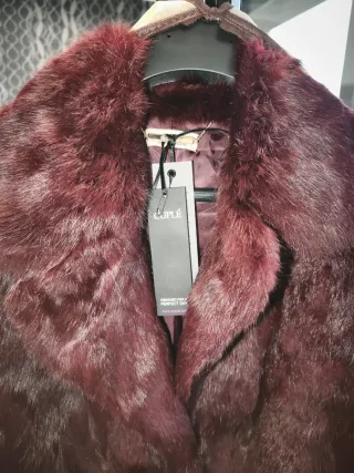 Precioso abrigo de piel auténtica de la marca Cuplé, en color vino. NUEVO CON ETIQUETA - Talla: Small - Largo - Material: Piel de conejo - Incluye una funda protectora.
