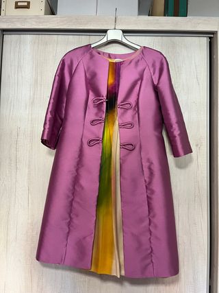 Conjunto de vestido de seda salvaje y abrigo de mikado rosa, de la marca Marcelino. Súper original y elegante. Lo usé solo una vez para una boda de otoño. El conjunto me costó más de 350€. Está impecable.