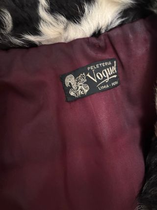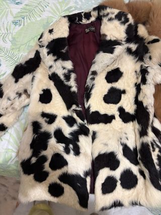 Chaqueta de piel con un llamativo diseño de manchas blancas y negras, similar al de una vaca. Es una prenda de peletería con un estilo único. - Diseño de manchas. - Material de piel.