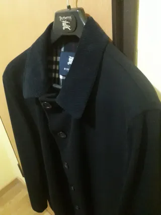 Chaquetón Burberry para caballero. - Color azul marino. - Cierre abotonado. - Cuello con solapas. - Forro interior a cuadros característico de la marca. - Talla 5 (L) - Nuevo sin etiquetas. - Composición: - Tejido: 95% lana merino - 5% poliamida. - Forro: 50% lana - 25% acrílico - 25% poliéster.