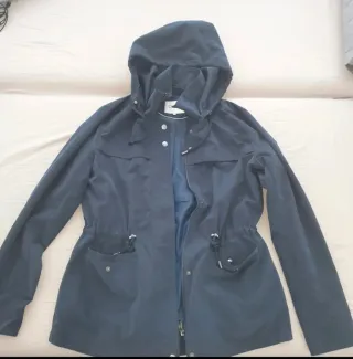 Chaqueta ligera de la marca Only, ideal para entretiempo. - Diseño con capucha. - Cierre de cremallera y botones. - Cintura ajustable con cordón. - Bolsillos frontales con botón. - Color azul marino. - Es talla M pero talla un pelín más. - Nueva sin etiqueta