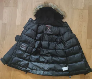Abrigo de la marca Geographical Norway en color negro. Presenta un diseño moderno y funcional. - Capucha con pelo. - Bolsillos frontales. - Cierre de cremallera. - Parche de la bandera de Noruega.