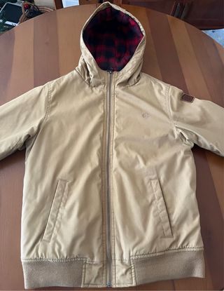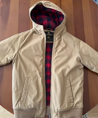Chaqueta marca Element en color beige, con un forro interior a cuadros en rojo y negro. Es una prenda de entretiempo, ideal para el día a día. - Cierre de cremallera. - Capucha. - Bolsillos laterales. TALLA 14 NIÑO