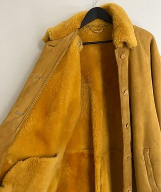 Abrigo tipo chaquetón de piel de la marca Loewe. Un diseño clásico y elegante. - Exterior de piel en tono amarillo. - Forro interior de pelo en color amarillo. - Cierre de botones. - Cuello de pelo. - Pelo de cordero.