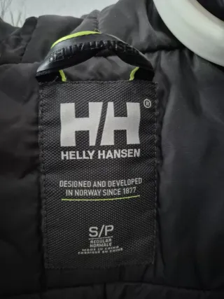 Abrigo de la marca Helly Hansen, diseñado y desarrollado en Noruega. Talla S/P (Regular Normale). Colo negro, muy abrigado, capucha con opción de quitar el pelo, doble abotonadura de cremallera y corchetes/botones. Bolsillo interior. Prácticamente nuevo y resistente al agua.