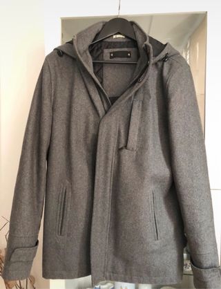 Abrigo de la marca Humor en talla S. Diseño moderno y versátil. - Color gris jaspeado. - Capucha integrada. - Bolsillos frontales. - Puños y bajo elásticos negros