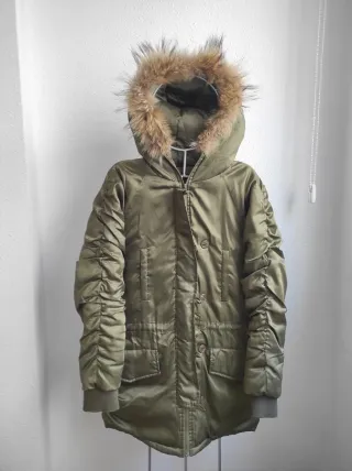 Abrigo de la marca Kalare en color verde oliva, con capucha y detalle de pelo. - Diseño con múltiples bolsillos. - Mangas abullonadas. - Cierre de cremallera y botones. Le falta el botón de arriba y tiene algunos roces como se ve en las fotos. - Largo 78 cm - Sisa 54 cm Ajustable en la cintura con cuerda interior