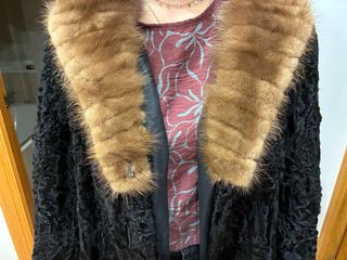 Elegante abrigo de piel de Astracán con cuello de pelo. - Diseño clásico. - Textura rizada característica del Astracán. - Cuello de pelo en tono marrón. -90 cm de largo -45 cm de hombro a hombro -no tiene marca (es antigua)