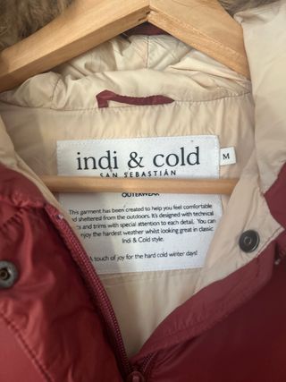 Abrigo acolchado de la marca Indi & Cold con un bonito acabado en color rojo. Cuenta con un detalle de pelo en la capucha. - Capucha con pelo., el pelo se puede quitar. - Cierre de botones y cremallera - Bolsillos laterales. -Las mangas se pueden quitar convirtiéndolo en un chaleco.