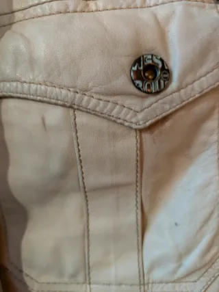 Chaqueta de piel cuero genuino en color beige, con un diseño moderno y versátil. Lleva bolsillos en pecho y laterales con tapetas y botones metálicos. Con cremallera metálica corta al lateral. Cuello camisero. Lleva guarda bolsa de piel con logo de la marca. Tiene uso ( se ve alguna marca en fotos). *Se puede comprar en persona en zona Santurce, Vizcaya. - Cierre de cremallera frontal. - Bolsillos con solapa y botón. - Detalle de hombreras. - Cuello camisero.