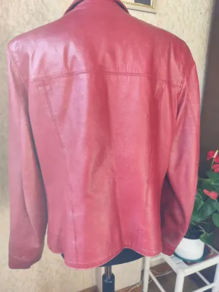 Chaqueta de cuero rojo (piel genuina ) de la firma Ramón Villamor. T 44. Forrada y con cremallera metálica frontal y bolsillos con cremallera en pectoral. Pequeña marca en borde de un bolsillo y marca de doblar las bocamangas.( Fotos). Muy ponible . Medidas Sisa ( axila a axila) 55 cm *Se puede comprar en persona en zona Santurce, Vizcaya. - Diseño clásico con cuello. - Cierre de cremallera frontal. - Bolsillos con cremallera en el pecho. - Bolsillos laterales.