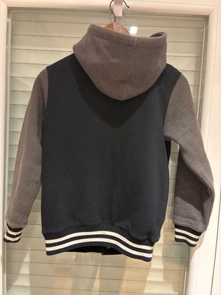 Chaqueta estilo universitario de la marca Vans. Combina paneles en color negro y gris, con capucha. - Mangas y capucha en gris. - Cuerpo principal en negro. - Cierre de botones a presión. - Puños y bajo con banda elástica a rayas.