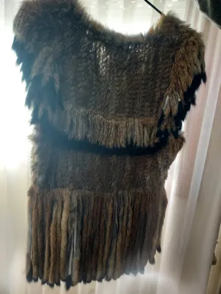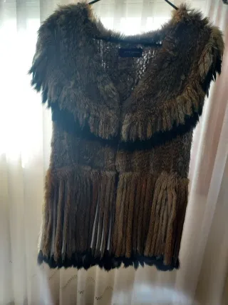 Elegante chaleco de pelo sintético en color negro. Su diseño moderno y la textura suave lo hacen una prenda versátil. Lleva bolsillos laterales y cierre de corchete. Tiene marcas de uso en zona cuello posterior. Resto, impecable. Muy versátil y ponible . *Se puede comprar en persona en zona Santurce, Vizcaya. - Diseño de pelo sintético. - Cierre frontal.
