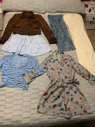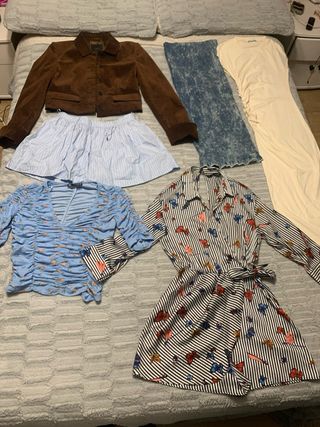 Conjunto de seis prendas nuevas de la marca Zara. Talla M todo. Todo sin usar. - Chaqueta marrón tipo pana de Zara talla M. - Falda corta de rayas azules y blancas. - Blusa azul con estampado floral y fruncidos. - Falda o vestido azul con efecto desgastado. (se puede usar de ambas formas) - Vestido largo beige de tejido fruncido. - Vestido camisero de rayas con estampado de mariposas.