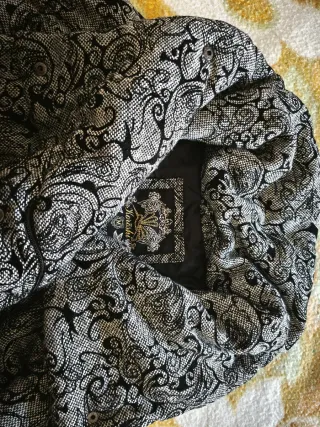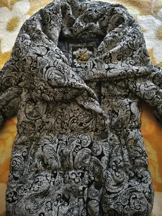 Elegante chaquetón de la marca Koroshi con un llamativo estampado. - Diseño con cuello alto. - Cierre de cremallera y botones lateral. - Estampado abstracto en blanco y negro. - Muy abrigado En buen estado, como nuevo