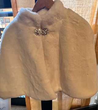 Elegante capa de novia, ideal para complementar tu atuendo nupcial. Su diseño suave y delicado añade un toque de sofisticación. - Cierre frontal con dos broches decorativos. - Material de pelo sintético muy suave al tacto. Está completamente nueva porque la compré para mi boda pero no la utilicé porque no me hizo falta. Puede dar desde una 40 a una 46, ya que solo se abrocha con un broche. Es preciosa y suave.