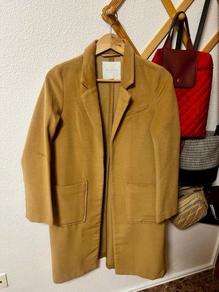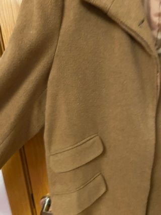 Abrigo de paño en color camel, perfecto para el entretiempo. 70% de lana. muy buena marca y calidad - Cuello camisero. - Cierre de botones. - Dos bolsillos frontales.