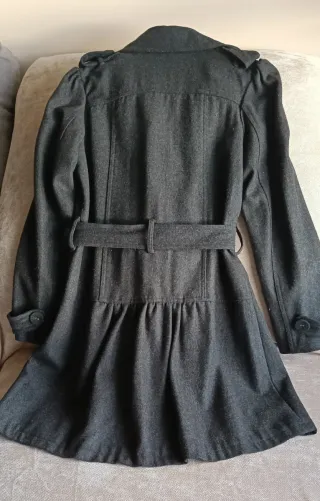 Abrigo de paño con un diseño entallado. - Color gris marengo. - Cinturón a juego. - Puños abotonados. - Cuello con solapas. -Gracias a terminación en forma de faldita
