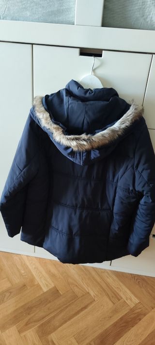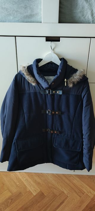 Trenca combinada: paño en la parte delantera y acolchada en mangas, espalda y capucha. La capucha es desmontable. Muy cómoda y calentita. Usada, pero en buenas condiciones aún.