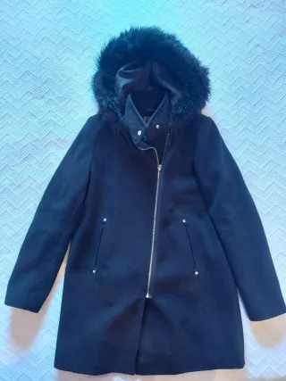 Elegante abrigo de paño con capucha. - Capucha con detalle de pelo. - Cierre de cremallera y botones. - Diseño moderno y abrigado. **No talla mucho