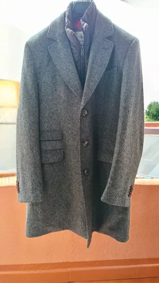 Elegante abrigo de paño de lana con un diseño clásico de espiga. Incluye un chaleco interior desmontable para mayor versatilidad. - Tejido de paño con patrón de espiga. - Incluye un chaleco interior acolchado extraíble, diseñado para ofrecer mayor aislamiento térmico y protección contra el frío. - Cierre de botones.