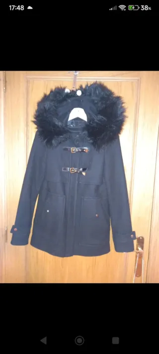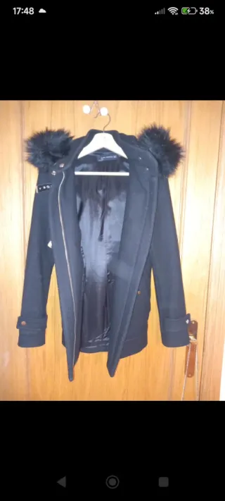abrigo de pelo negro, usado una sola vez, súper calentito, talla XS, cierre con corchetes