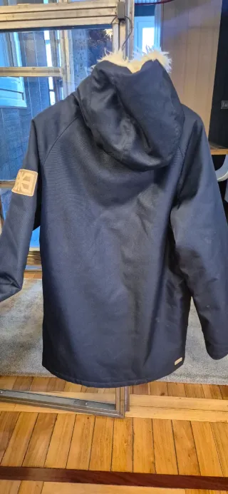 Chamarra azul de la marca Makia con un acogedor gorro de pelo. - Cierre de botones. - Bolsillos frontales. - Detalle de parche en manga.