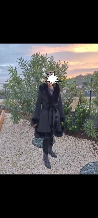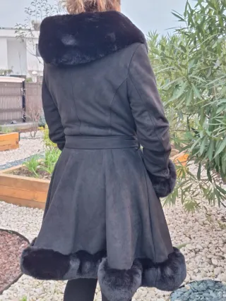 Abrigo negro de antelina con detalles de pelo. - Muy abrigadito. - Cinturón para ajustar. - Puños y cuello con pelo.