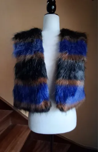 Chaleco de pelo sintético con un diseño de rayas multicolor. Es una prenda llamativa y suave al tacto. - Diseño de rayas horizontales. - Textura peluda y mullida. - Abertura frontal. De axila a axila 48 cm. Largo 48 cm.