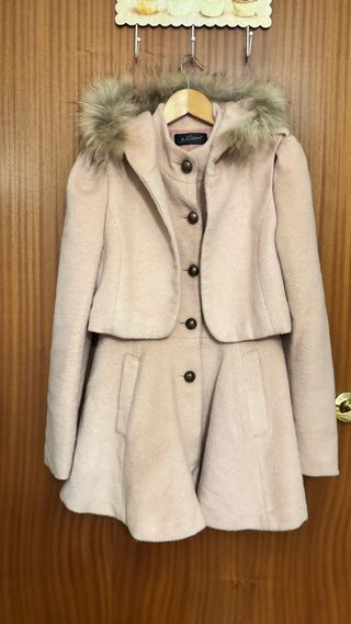 Precioso abrigo de color rosa palo con capucha y detalle de pelo en la capucha. El abrigo consta de dos partes. 1 abrigo entallado con Vuelo en la parte de abajo, y chaleco con capucha.  se puede usar tanto junto como separado  - Diseño elegante. - Cierre de botones. - Capucha con pelo sintético.