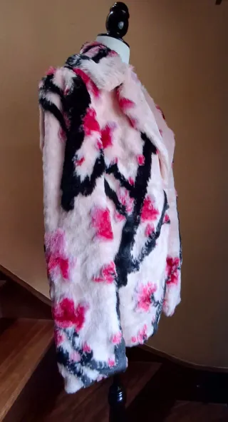 Elegante chaquetón de pelo con un llamativo estampado floral. Colores rosa, fucsia y negro. - Diseño de Guess. - Base en color rosa con ramas y flores. - Tacto suave y cálido. - 2 bolsillos laterales - Con forro - Cierre con ganchos. Como nuevo