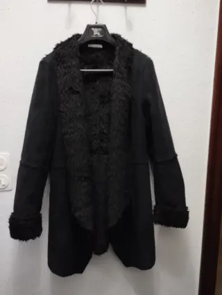 Abrigo negro con un forro interior muy cálido y suave. - Diseño elegante y moderno. - Acabado exterior tipo ante. - Detalle de pelo sintético en cuello y puños.