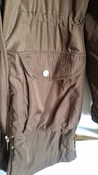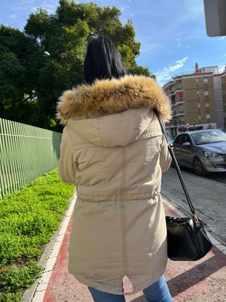 Abrigo estilo parka con forro interior y detalles de pelo en la capucha. - Cierre de cremallera y botones. - Cintura ajustable con cordón. - Bolsillos frontales con solapa. - Puños elásticos.
