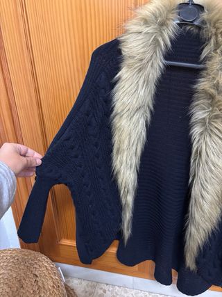 Elegante poncho de punto con un suave cuello de pelo sintético. - Diseño de punto con detalles calados. - Cuello de pelo desmontable. - Corte amplio y cómodo.