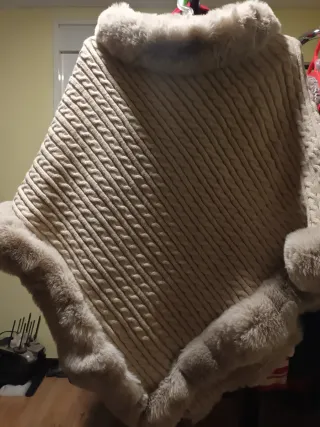 Elegante poncho de punto con un suave acabado de pelo. - Diseño de punto trenzado. - Detalle de pelo en cuello y bajos. - Talla única. Rebaja temporal 15€ después 20€