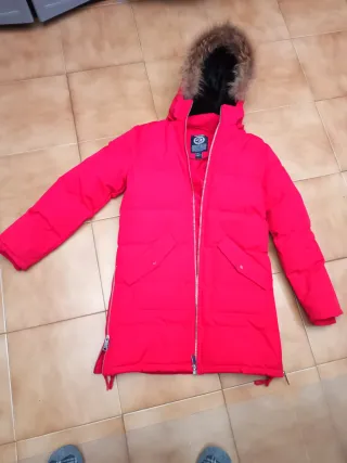 Abrigo de invierno con capucha y pelo. Desmontables Muy abrigado y aguanta lluvia y nieve. El color es rojo intenso, las fotos salen mal , - Diseño acolchado. - Cierre de cremallera frontal. Y dos cremalleras laterales de cadera. - Bolsillos laterales con cremallera. - Puños ajustables.. Nuevo... Se vende por equivocación en la talla