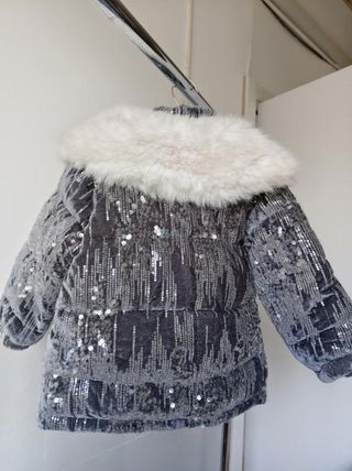 Abrigo de algodón para niña con un diseño brillante y elegante. - Detalle de lentejuelas plateadas. - Cuello con acabado de pelo blanco. - Tejido suave y confortable.