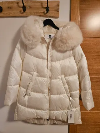 Abrigo acolchado de color blanco. Nuevo, sin estrenar. Cuenta con capucha capucha que se puede quitar. Los bolsillos tienen cremallera. Es una M que será como una talla 40