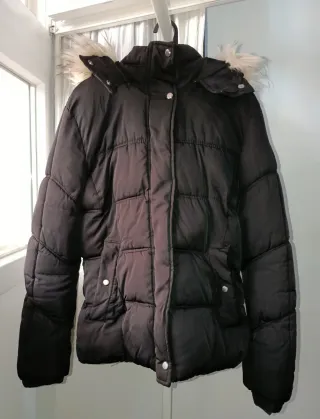 Abrigo negro con diseño moderno y sofisticado, ideal para los días fríos. Cuenta con capucha forrada de suave peluche que brinda mayor abrigo y un toque de estilo único. Su color negro lo hace fácil de combinar con cualquier outfit, perfecto tanto para looks casuales como más formales. Cómodo, abrigador y versátil, es una prenda imprescindible para esta temporada. Le falta el tirador de la cremallera, pero tiene botones. - Bolsillos frontales. - Puños elásticos.