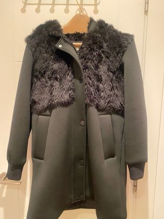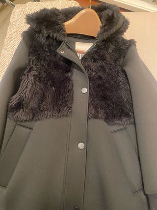 Abrigo con detalles de pelo sintético y capucha. - Cierre de cremallera y botones. - Bolsillos frontales. - Forro interior suave. -Color negro Sin casi uso En perfecto uso