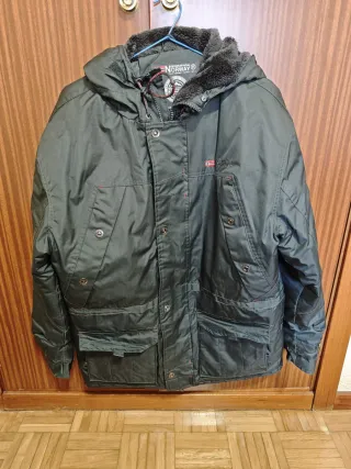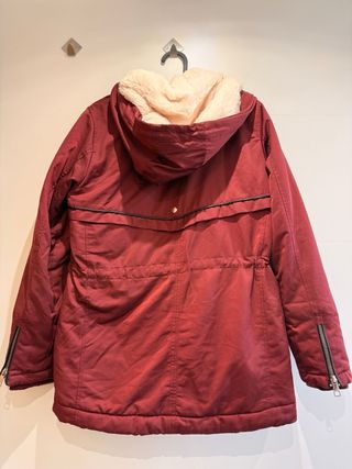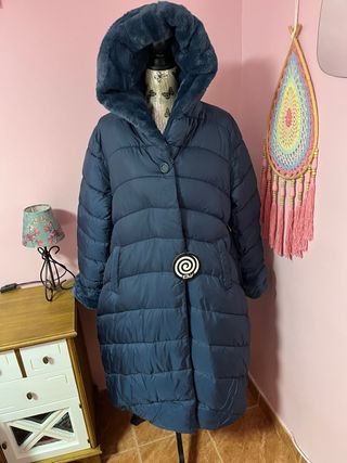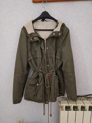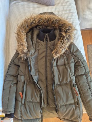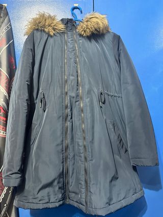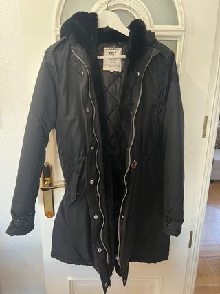 Abrigo tipo parka larga con capucha, ideal para el frío. - Forro interior de pelo sintético. - Cierre de cremallera y botones. - Cordón ajustable en la cintura. - Bolsillos frontales. Como nuevo!!