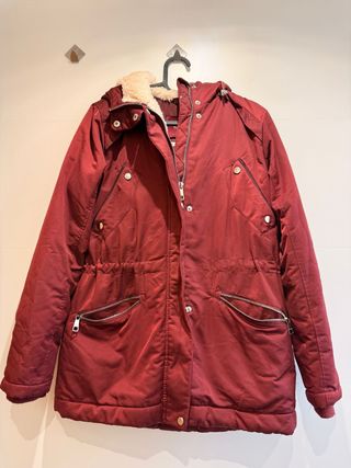 Abrigo de paño en color rojo, ideal para el frío. - Capucha con detalle de pelo sintético. - Cierre de cremallera y botones. - Diseño tipo duffle coat.