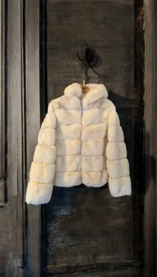 Abrigo de pelo sintético en color blanco. Es una prenda suave y cálida, perfecta para los días fríos. - Cierre de cremallera. - Cuello redondo. - Manga larga.