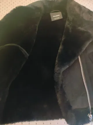 Chaqueta de pelo de pull&bar, abrigada y calentita. Estilo biker con cuello, puños y todo el interior de pelo. Cierre asimétrico con cremallera y con cinturón de cierres en la parte de abajo para podere ajustar. Medida de hombro hasta abajo de 48 cms Prácticamente nueva, puesta un par de veces solo. Precio en tienda 50€.