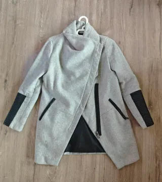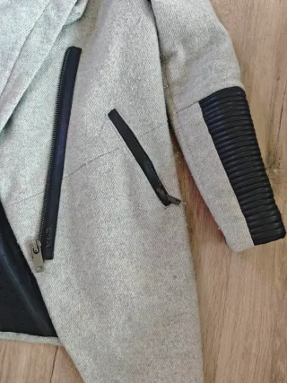 Abrigo de corte moderno con un diseño asimétrico y detalles en las mangas en cuero negro. El interior de la solapa se está pelando el cuero, pero se puede limpiar y abajo hay tela negra, con lo que se nota, de ahí el precio. - Cuello alto envolvente. - Cierre cruzado con cremallera. - Bolsillos frontales con cremallera. - Puños con diseño acanalado.