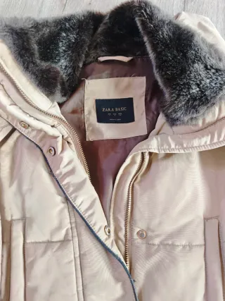 Abrigo corto de Zara en color beige. Presenta un diseño acolchado y detalles de canalé en los laterales. Algunas partes del cuero negro se está pelando, pero se puede quitar y ni se nota, ver foto 5y6 - Cuello con pelo sintético. - Cierre de cremallera y botones. - Capucha integrada.