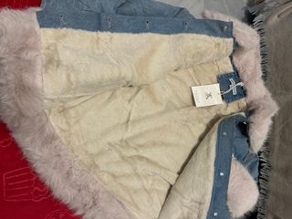 Chaqueta vaquera con detalles de pelo sintético en color rosa. - Cuello y puños con pelo. - Bajo con pelo. - Bolsillos delanteros con solapa y detalle de pelo. - Cierre de botones. -El pelo del cuello tiene botones y se puede quitar