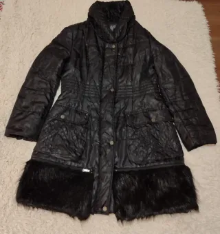 Elegante abrigo con detalles en piel y pelo sintético. Súper calentito. - Diseño con cinturón para ajustar. - Forro interior suave de pelo. - bajo con acabado de pelo.
